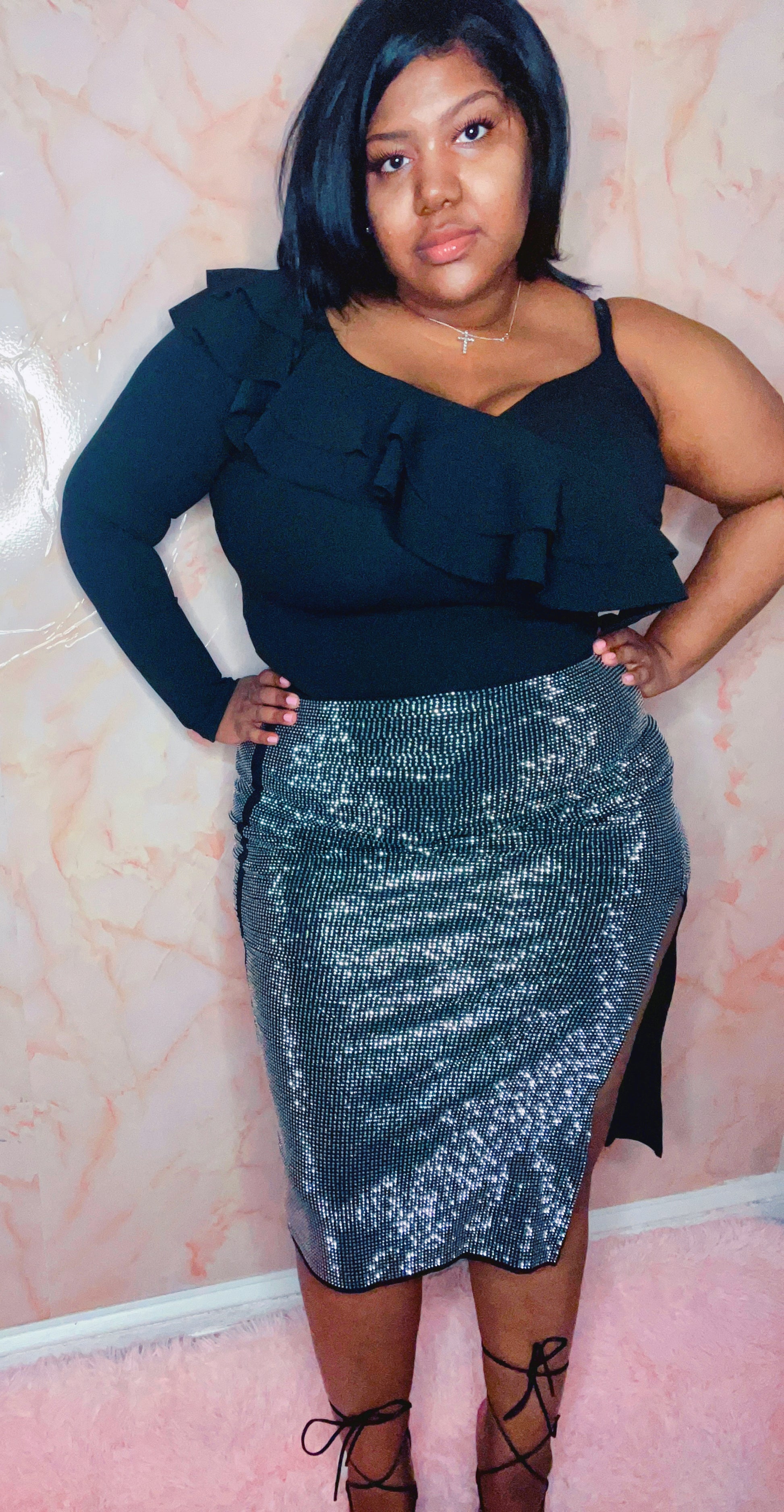 Just for Bling skirt can be worn with a nice Blouse or Top of choice . It goes well with heels and a cute Bag. It will show your curves and have you looking and feeling pretty.